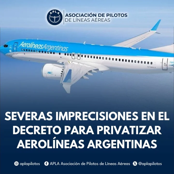 Bajo el título “𝗦𝗲𝘃𝗲𝗿𝗮𝘀 𝗶𝗺𝗽𝗿𝗲𝗰𝗶𝘀𝗶𝗼𝗻𝗲𝘀 𝘀𝗼𝗯𝗿𝗲 𝗲𝗹 𝗗𝗲𝗰𝗿𝗲𝘁𝗼 𝟴𝟳𝟯/𝟮𝟬𝟮𝟰 𝗽𝗮𝗿𝗮 𝗹𝗮 𝗽𝗿𝗶𝘃𝗮𝘁𝗶𝘇𝗮𝗰𝗶𝗼́𝗻 𝗱𝗲 𝗔𝗲𝗿𝗼𝗹𝗶́𝗻𝗲𝗮𝘀 𝗔𝗿𝗴𝗲𝗻𝘁𝗶𝗻𝗮𝘀”, la Asociación de Pilotos de Líneas Aéreas (APLA), respondió al reciente decreto publicado en el Boletín Oficial por el Poder Ejecutivo nacional con el que se determinó que la empresa estatal quedó sujeta a privatización.