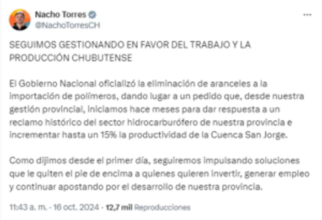 La eliminación del arancel del 14% a la importación de polímeros se suma a la baja del impuesto PAIS en 10 puntos, vigente desde septiembre. Juntas, estas iniciativas suponen una disminución en el costo de importación de estos productos superior al 20%. Este esfuerzo fue gestionado por el gobernador de Chubut, Ignacio Torres, ante el ministro de Economía de la Nación, Luis Caputo. La propuesta se encuadra en un programa de fomento destinado a la reactivación y sostenimiento de la Cuenca del Golfo San Jorge.