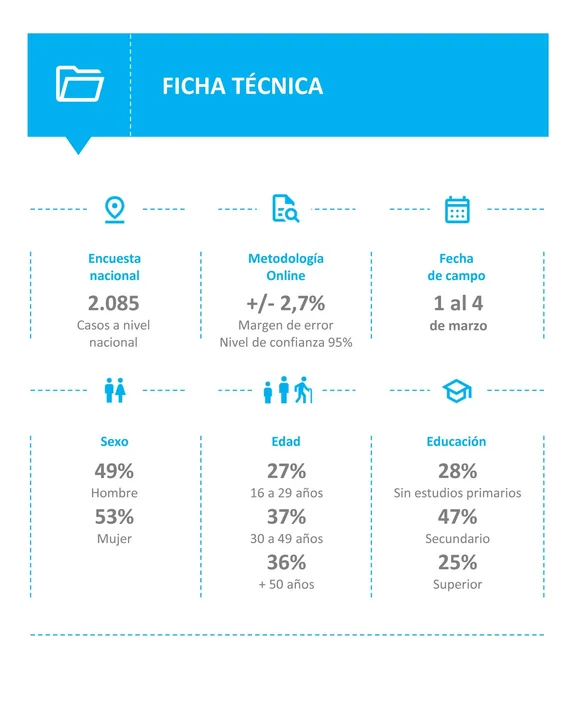La encuesta se realizó a nivel nacional con una muestra de 2.085 casos, mediante metodología online, con un margen de error de ±2,7% y un nivel de confianza del 95%.