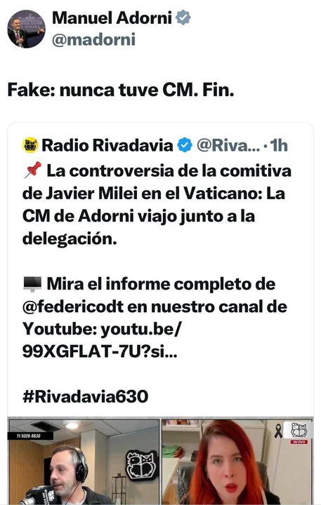 El vocero presidencial Manuel Adorni negó este sábado que tenga un community manager (CM), tras la polémica por la presencia de Macarena Rodríguez en la comitiva que acompañó a Javier Milei al funeral del papa Francisco en Roma.