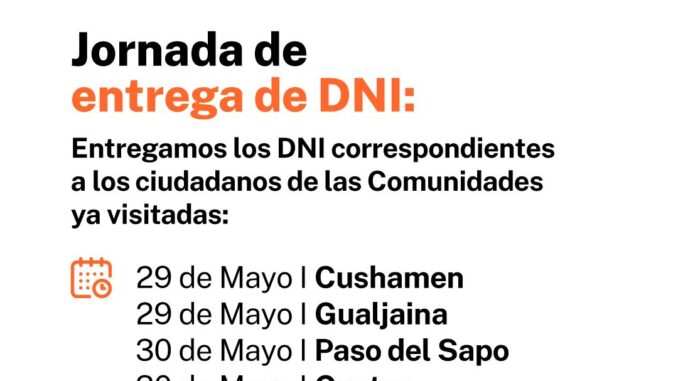 El Gobierno del Chubut, que conduce Ignacio “Nacho” Torres, informa que comenzará la entrega de los Documentos Nacionales de Identidad (DNI) tramitados durante el Operativo de Documentación desarrollado entre el 21 y el 25 de abril en las localidades de Cushamen, Gualjaina, Paso del Sapo y Gastre.