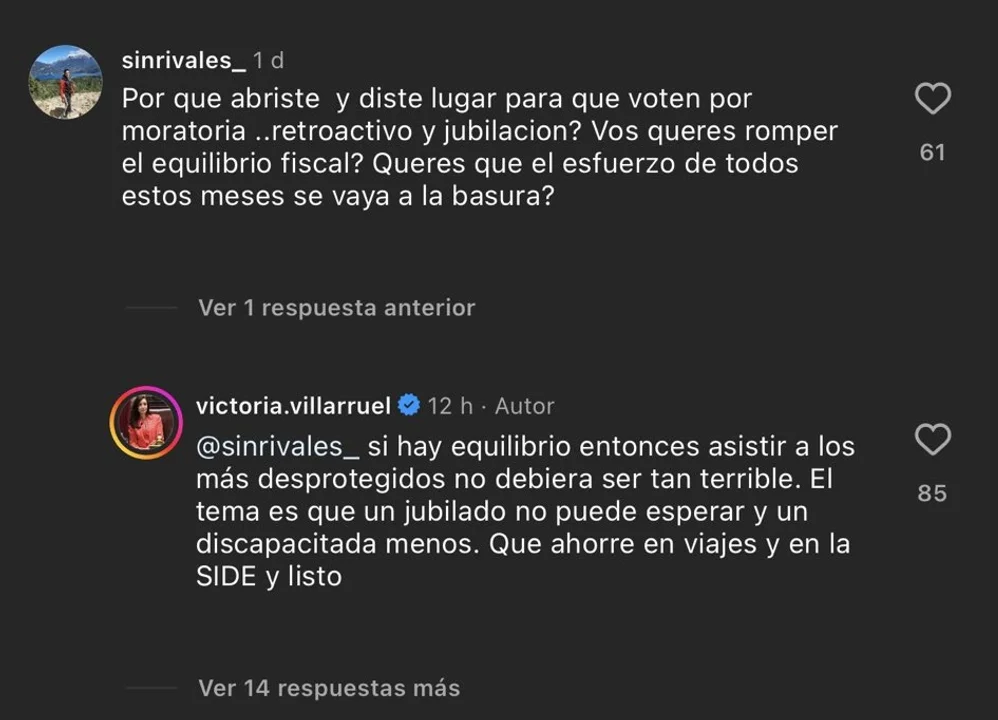 El intercambio de Villarruel en su cuenta oficial de Instagram se dio horas después de que el Senado aprobara leyes que ponen en aprietos al Gobierno en términos fiscales como el incremento en las jubilaciones.