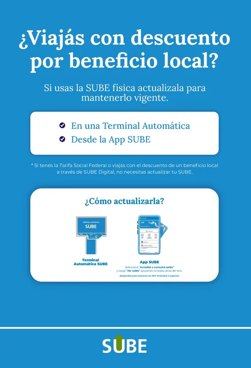 El Gobierno del Chubut, a través del Ministerio de Gobierno, informa que SUBE puso en marcha un proceso de actualización técnica del sistema, que requiere que las personas usuarias que utilicen la tarjeta física y cuenten con descuentos locales realicen una validación para asegurar que los beneficios sigan activos al momento de viajar.
