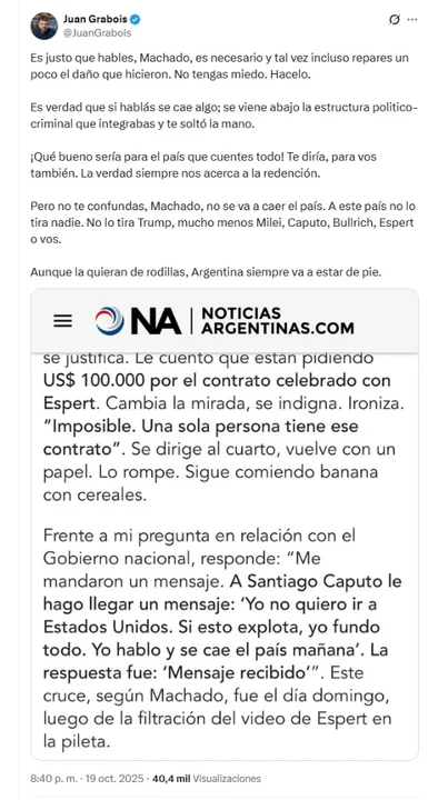Según supo Noticias Argentinas, Grabois publicó un mensaje en su cuenta de X (antes Twitter) en el que se dirigió directamente a Machado. «Es justo que hables, Machado, es necesario y tal vez incluso repares un poco el daño que hicieron. No tengas miedo. Hacelo», escribió el dirigente.
