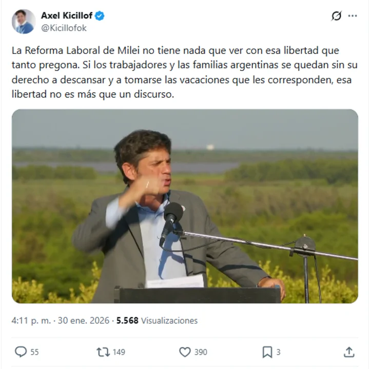 Buenos Aires, 30 enero (NA) – El gobernador bonaerense, Axel Kicillof, apuntó este viernes contra el proyecto de reforma laboral del presidente Javier Milei y afirmó que la iniciativa oficialista “no tiene nada que ver con esa libertad que tanto pregona”.