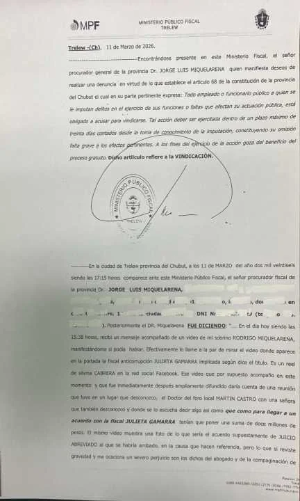 La denuncia fue formulada por Miquelarena este miércoles ante el fiscal general Omar Rodríguez y se puso a disposición en el marco del derecho de vindicación previsto en la Constitución, el artículo 68, que refiere que todo funcionario público que se encuentre sospechado de participar en un hecho delictivo tiene la obligación de presentarse para ser investigado y todo lo que surja del video.